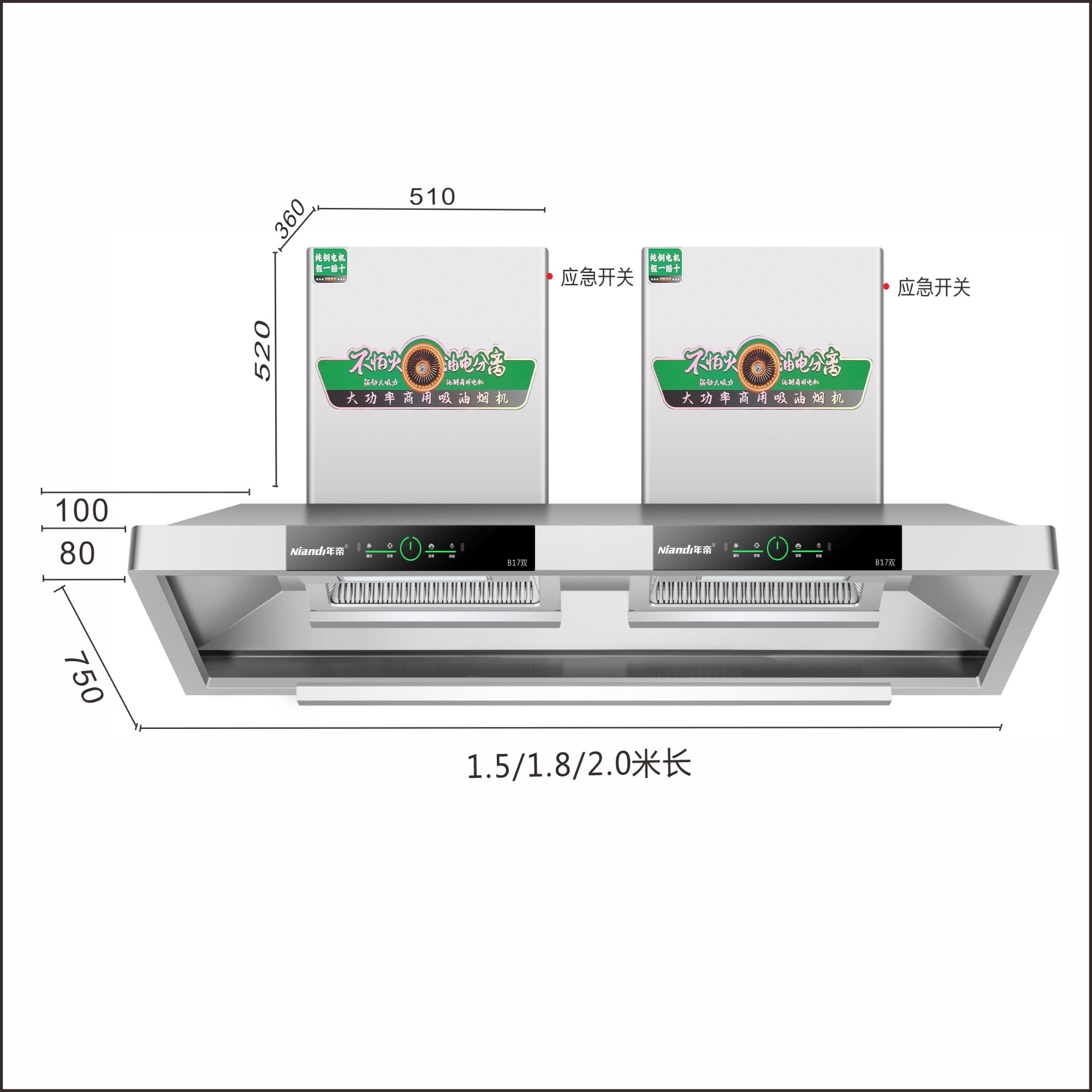 0.8加厚不锈钢机身;图腾EMC国标体感+触摸开关;顶吸式油烟分离油网;50叠1000W全封闭纯铜线商用电机 ;280*150mm特佛龙黄金眼不粘油加重风轮;应急开关,LED冷光灯;2米加厚直径200加厚加密铝箔烟管;标配:4*2米钢丝吊绳,安装支架; 1.5米¥4480.001.8米¥4780.002.0米¥4980.00