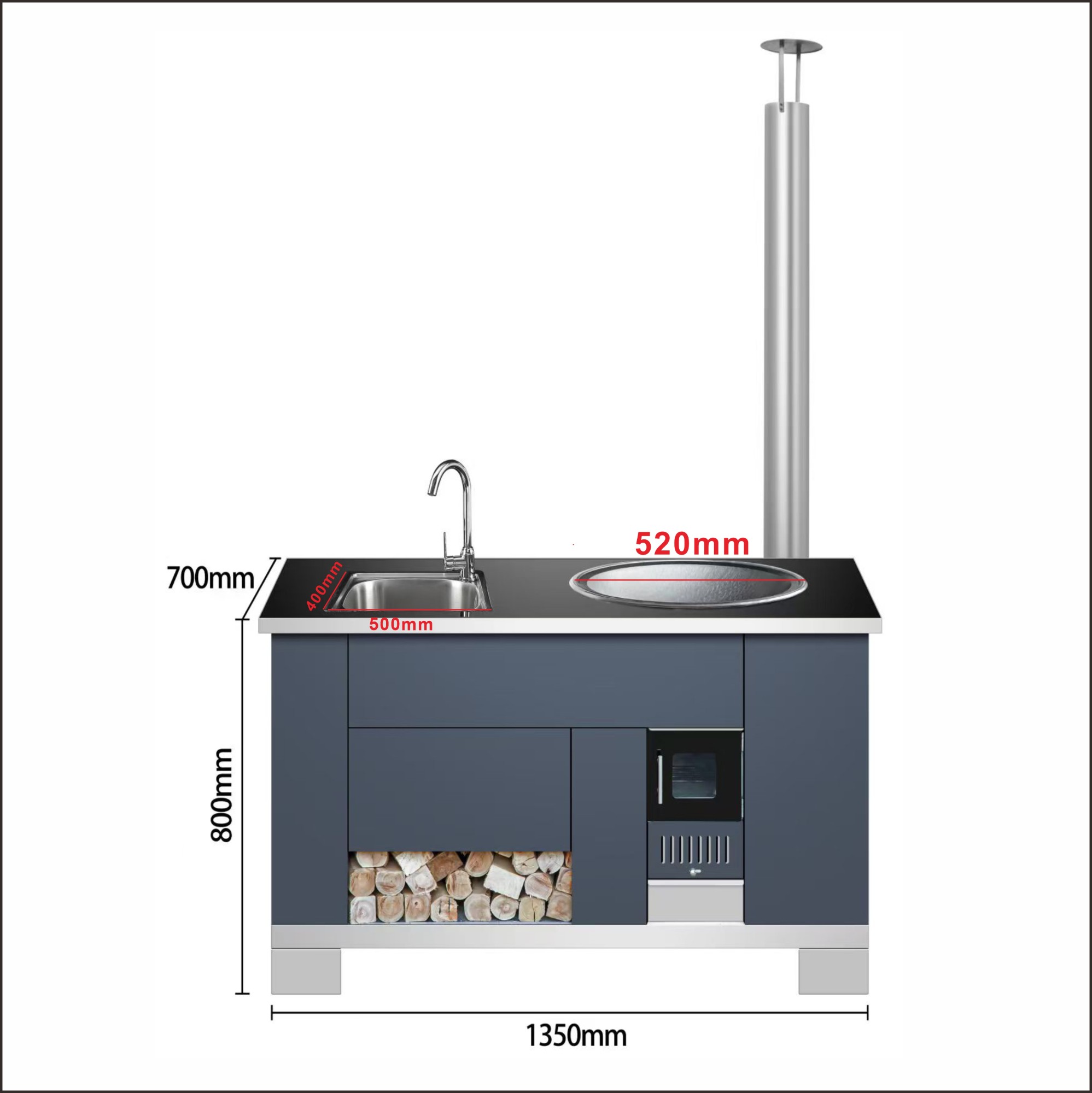 ★农村无烟柴火大锅灶,一柴火锅,一个水槽;★排烟出风方向可以右侧/右后可以定制出风管 ;★节能环保产品,烧柴时比普通砖土灶节约柴30%以上;★标配直径100mm共1.5米长不锈钢排烟管;★ 0.8厚钢化玻璃台面,结实耐用;★灰色彩钢板机身设计: ¥5280. 00